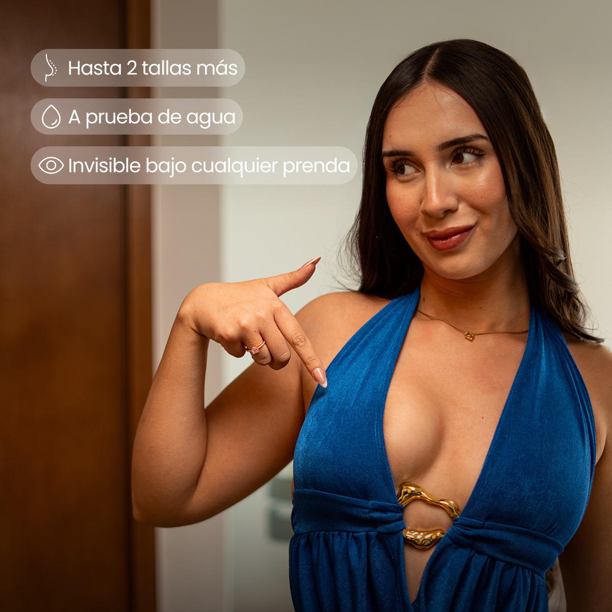 Boost es una almohadilla adhesiva reutilizable que se pega tanto a tu piel como a la ropa, levantando y juntando el busto para darte hasta 2 copas más de realce al instante. Ideal para escotes profundos, vestidos sin espalda o ropa ajustada donde un sostén tradicional no funciona.