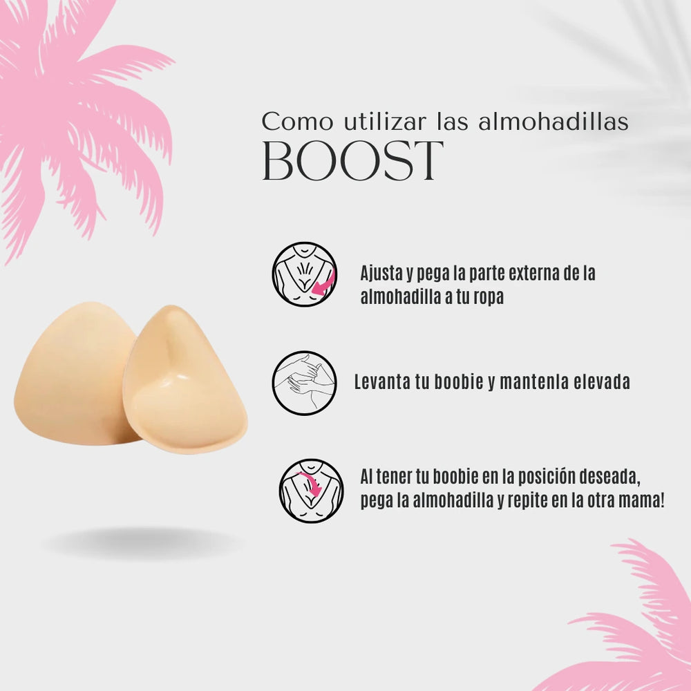 Boost es una almohadilla adhesiva reutilizable que se pega tanto a tu piel como a la ropa, levantando y juntando el busto para darte hasta 2 copas más de realce al instante. Ideal para escotes profundos, vestidos sin espalda o ropa ajustada donde un sostén tradicional no funciona.